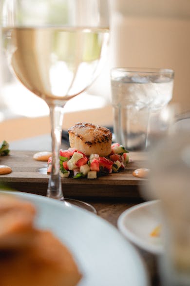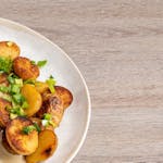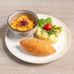 mix sałat, pomidorki koktajlowe, ogórek, cebulka, autorskie stripsy z kurczaka, pieczywo z pieca, firmowy sos czosnkowy, sos vinegrette -