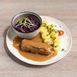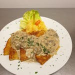 polędwiczki w prosciutto crudo z sosem grzybowym,kluski,buraczki